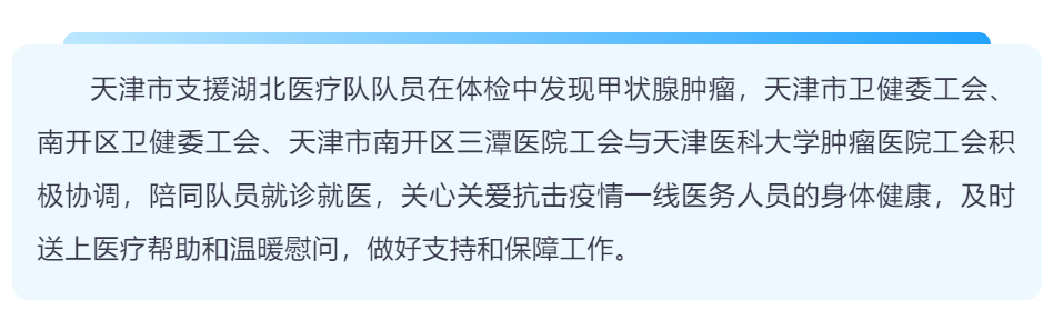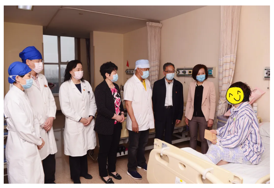 术后,天津市卫健委工会主席房春来、南开区卫健委副主任崔莉带领市卫健委、区卫健委相关领导看望慰问住院队员,天津市南开区三潭医院党总支书记施洁、工会主席及副院长王萍、副院长裴锦云,天津医科大学肿瘤医院工会代主席章德全等陪同,仔细叮嘱队员照顾身体,为队员带来慰问品和温馨鼓励。