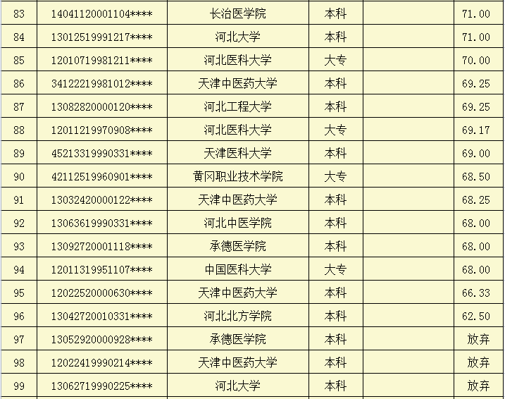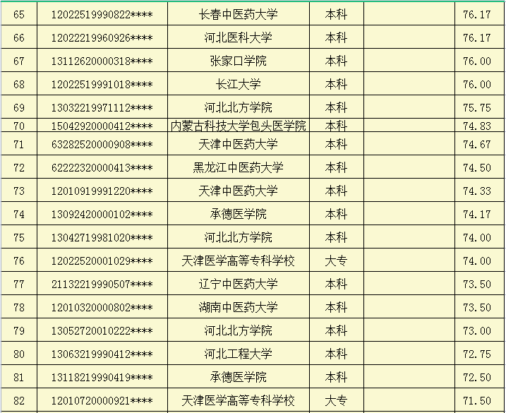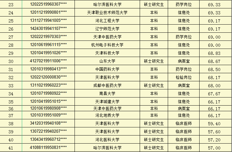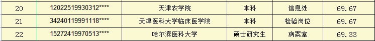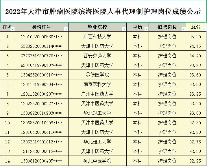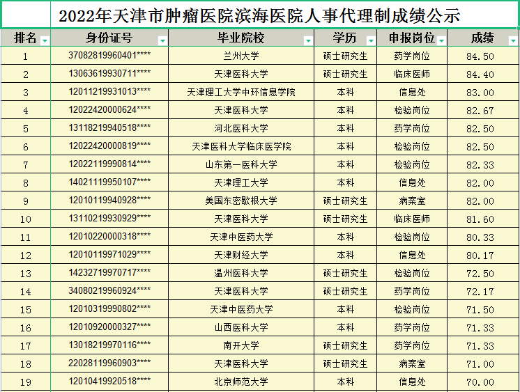 天津市肿瘤医院滨海医院2022年人事代理制岗位招聘面试成绩