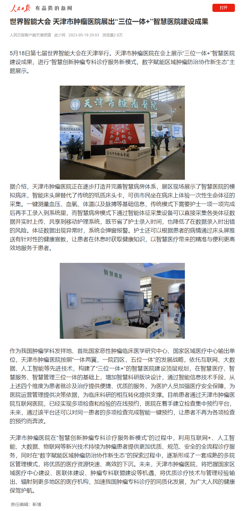 世界智能大会 天津市肿瘤医院展出“三位一体+”智慧医院建设成果--《人民日报》