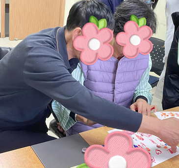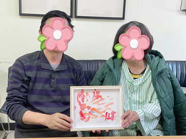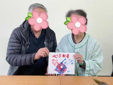 另一侧,结婚四十年的刘阿姨和丈夫陈伯伯并排坐着,两位老人将各自沾满颜料的手掌紧紧并排按在卡纸上。“心手相牵。”内敛的陈伯伯轻声念道,刘阿姨倚靠在他肩头,笑容温暖。