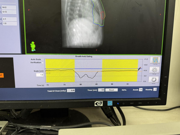 当激光线精准对准体膜上的标记点后,小张开始指导她进行屏气练习:“请深吸一口气,然后保持住……很好,保持20秒……现在可以正常呼吸了。”李女士第一次尝试就完成得很平稳。小张看着监视器上稳定的呼吸曲线,鼓励道:“您的屏气很稳,这对后续治疗非常有利!”