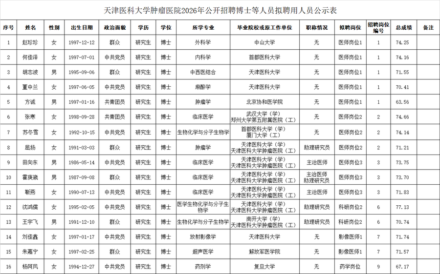 附:天津医科大学肿瘤医院2026年公开招聘博士等人员拟聘用人员公示表